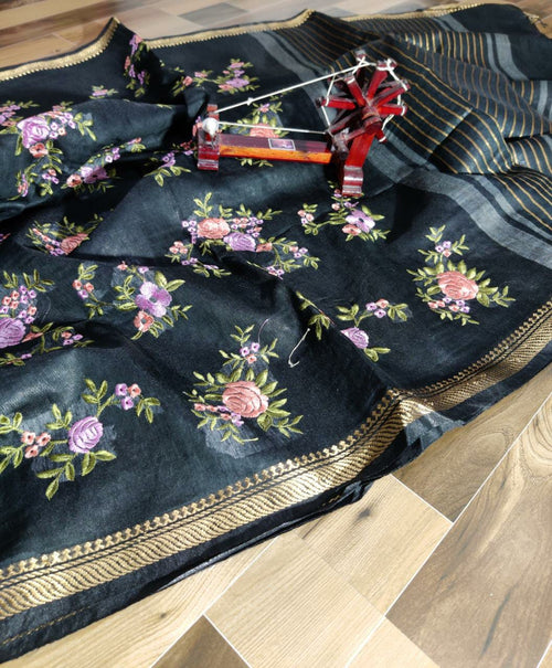 Black Silk Linen Saree with Floral Embroidery